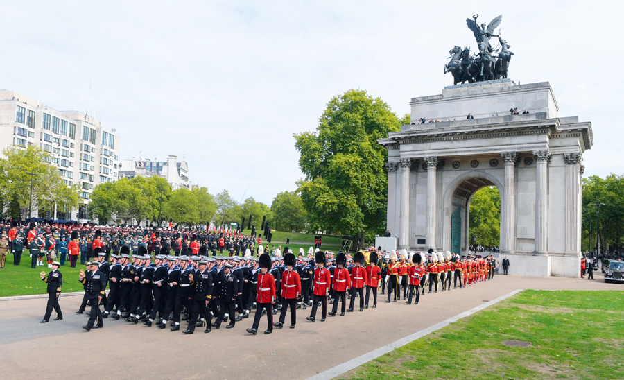 Квадрига на Арке Веллингтона в Лондоне. Автор – Адриан Джонс. Композиция показывает, как Ангел мира парит над военной колесницей. Проход под аркой ведет к Букингемскому дворцу. На фото – церемония прощания с Королевой Елизаветой II в 2022 году (фото: Zuma\TASS)