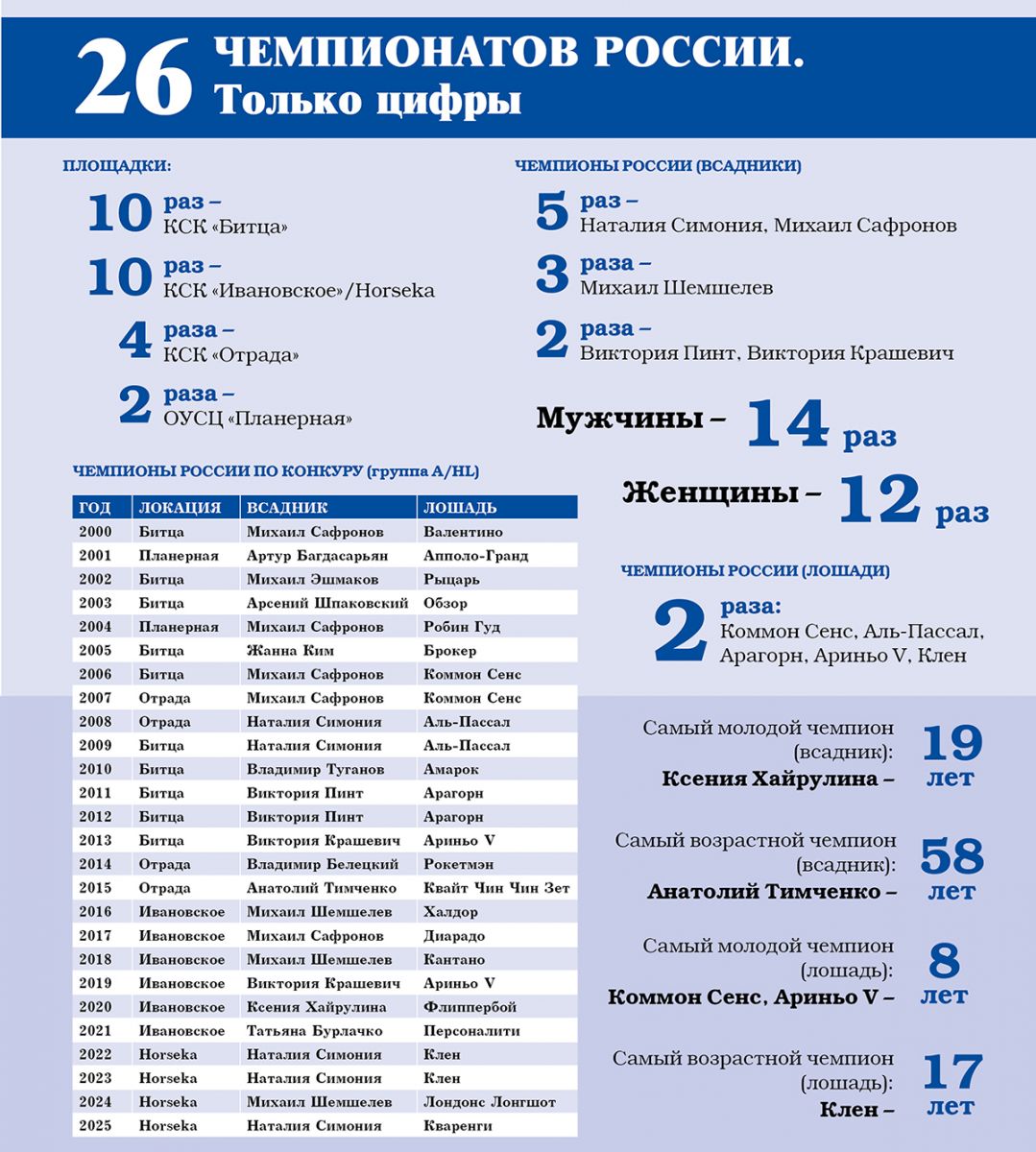 Последние годы истории отечественного конкура прочно связаны с именем Наталии Симонии. Спортсменка золотыми буквами вписала свое имя в технические результаты главного старта страны. В 2022–2023 годах она вернулась на первую строчку протоколов с легендарным серым полукровным Кленом, а в 2025 выиграла титул с ганноверским жеребцом Кваренги.