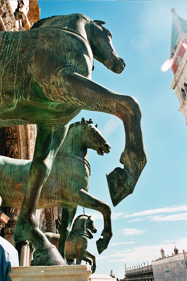 Почти детективная история произошла с четверкой лошадей из золоченой бронзы, которая украшала верхнюю часть фасада собора Святого Марка в Венеции. Она была изготовлена в IV веке н. э. и находилась на ипподроме в Константинополе. Квадригу перевезли в Венецию крестоносцы после того, как разграбили Константинополь в 1204 году. Но оттуда ее в свою очередь вывез в Париж Наполеон после завоевания Венеции в 1797 году. В 1815 году ее вернули на прежнее место, но сейчас она находится в музее собора, а на его фасаде установлена точная копия.