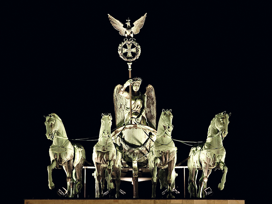 Квадрига на Бранденбургских воротах в Берлине. Автор – Йоханн Готфрид Шадов. Лошадьми управляет богиня мира Ирида с оливковой ветвью. После того, как Наполеон вывез ее в Париж, она вернулась как символ победы, и с тех пор стала называться Викторией с Железным крестом