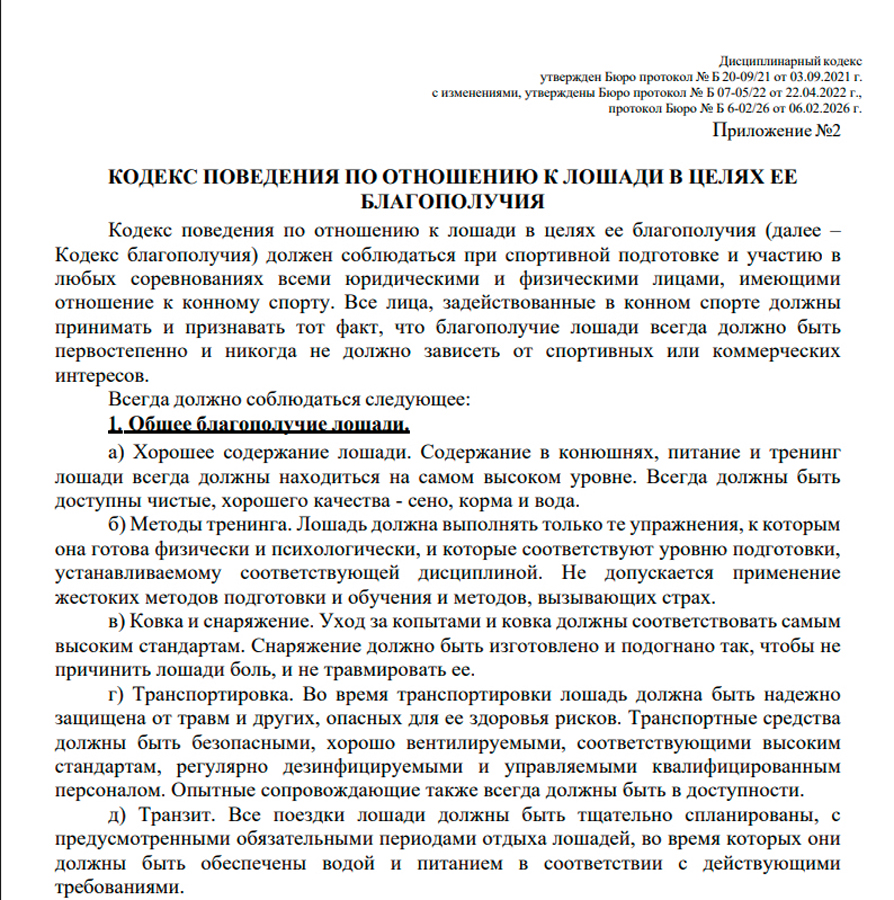 Федерацией конного спорта России принят и «Дисциплинарный кодекс», в который в начале 2026 г. были внесены изменения, ужесточающие санкции в отношении лиц, допускающих неэтичное отношение к лошадям.